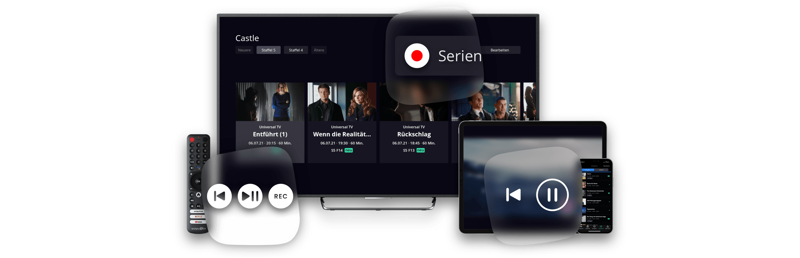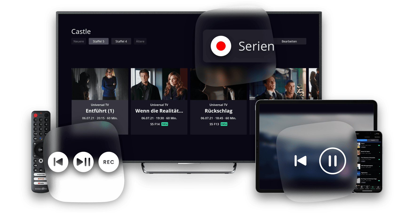 Kabelanschluss war gestern, Fernsehen ist da, wo Ihr WLAN ist - ganz ohne Kabelsalat. So können Sie individueller, flexibler und einfach schöner fernsehen - wann, wie und wo Sie wollen. Und das sogar auf mehreren Geräten gleichzeitig. waipu.tv bietet mehr als 300 Sender, davon über 290 in HD und mehr als 30.000 Filme, Serien und Shows auf Abruf. Bestellen Sie jetzt das perfekte TV-Erlebnis für die ganze Familie. Ob auf dem Smartphone, Fernseher, Laptop oder Tablet: waipu.tv bietet für alle Geräte in der ganzen Wohnung das perfekte TV-Vergnügen.